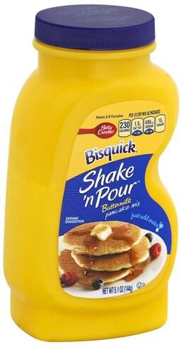 Bisquick Shake 'n Pour Pancake Mix Buttermilk - GIANT Save bottle and call 1-800-345-2443. . 1. Add 2/3 cup cool water to container; replace lid tightly. 2. Turn bottle upside down; tap lid. Shake container hard for 30 seconds. Loosen any remaining mix; shake again. 3. Pour batter onto hot greased skillet (If batter is too thick, add up to 1 tbsp cool water).
