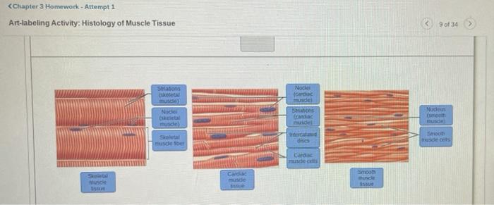 Solved Art-labeling Activity: Histology of Muscle Tissue 15 - Chegg Art-labeling Activity: Histology of Muscle Tissue 15 of 22 Reset Help intercalated discs Skelet muscle sbor Cardiac muscle cells Nucleus smooth muscle Smooth muscle cos Strations cardiac musco) Strabons skola muscel Nucle (candid muscle) Cardia Smoom muscle tissue muscle tissue muice tissu Nucle skoletai musco)