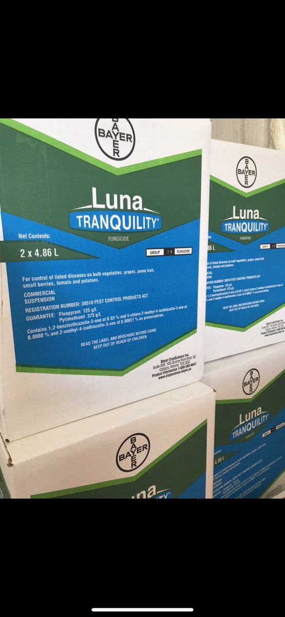 Luna Tranquility - BAYER fungicide LUNA TRANQUILITY Fungicide is a broad spectrum fungicide with preventative, systemic, and curative properties recommended for the control of certain crop diseases. ... Crops listed on this label and other tuberous and corm vegetables, berries, tomatoes and ginseng may be rotated anytime following the last application of Luna Tranquility. All ... Luna Tranquility - BAYER fungicide Product instructions: Begin fungicide applications preventatively, or at green tip. Continue as needed on a 7- to 10-day interval. When disease pressure is severe, use the higher rates and/or shorter intervals. Restrictions: Do not apply more than 54.7 fl oz of LUNA TRANQUILITY per acre per season. Label for 4493 - LUNA TRANQUILITY - Bartlett LUNA TRANQUILITY: Product Size: 8 x 2 L: Product Type: Fungicides: Product Supplier: Bayer CropScience Inc. Product PCP#: 30510: Active Ingredient: Fluopyram, Pyrimethanil: Label Supplier: ... 11/09/2021: Date Updated: 02/11/2022 (on our system) Review Comments: PDF File: Luna Tranquility Label English.pdf ...