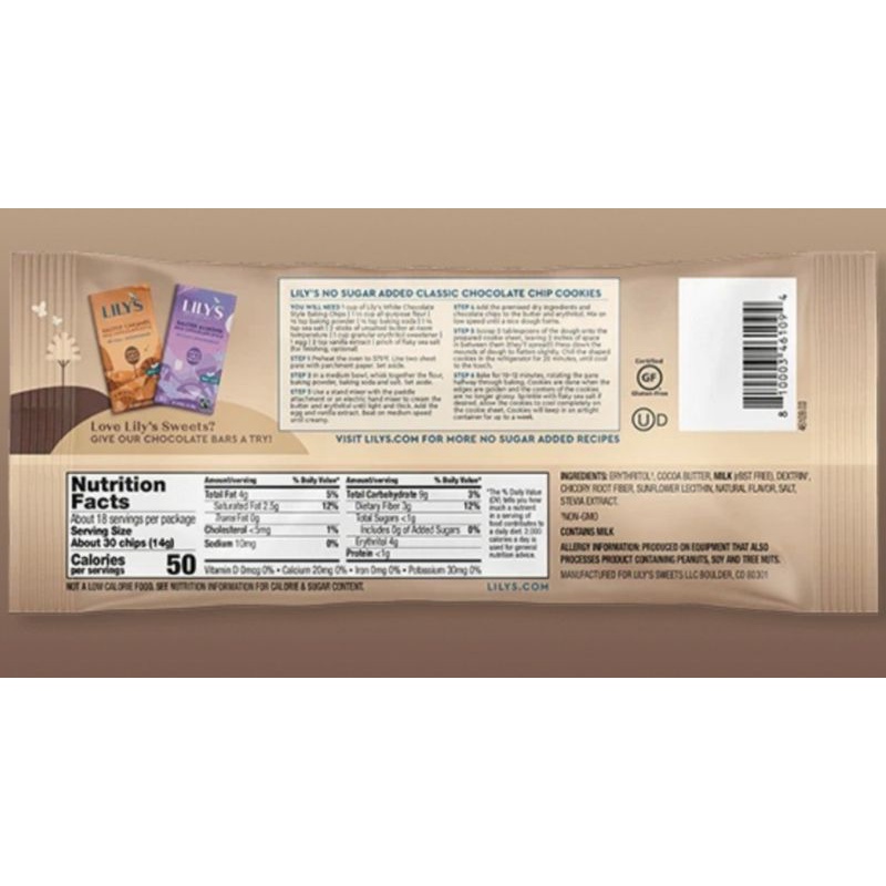 Lily's Milk Chocolate Style Baking Chips -- 9 oz - Vitacost Lily's Milk Chocolate Style Baking Chips Description. Less Sugar - Sweet Life. 32% Cocoa. Stevia Sweetened. No Sugar Added. Gluten Free. Fair Trade. ... Nutrition Facts. Serving Size: 30 Chips (14 g) Servings per Container: About 18. Amount Per Serving % Daily Value: Calories: 55: Calories from Fat: 35: Total Fat: 4 g: