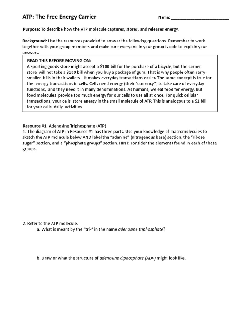 1 draw and label an atp molecule make sure to include 1. Draw and label an ATP molecule. Make sure to include the 3 parts. 2. What is the process called when a phosphate is added to the ADP molecule a. Photosynthesis b. Phosphorylation c. Permeability d. Precipitation 3. The metabolism (breakdown) of ________________ in the mitochondria provides the energy for the phosphorylation ofADP.a. ATP b. PDF worksheet chemical energy and ATP - Frontier Central School District Identify the parts of an ATP molecule below: (Label adenosine, ribose, ... What happens to the ATP molecule when a phosphate group is removed ? (what does it turn into?) 8. Draw a diagram below showing the cycle of ATP and ADP below (see Figure 4.2 on page 101) 9. What type of organic compounds store the most energy?