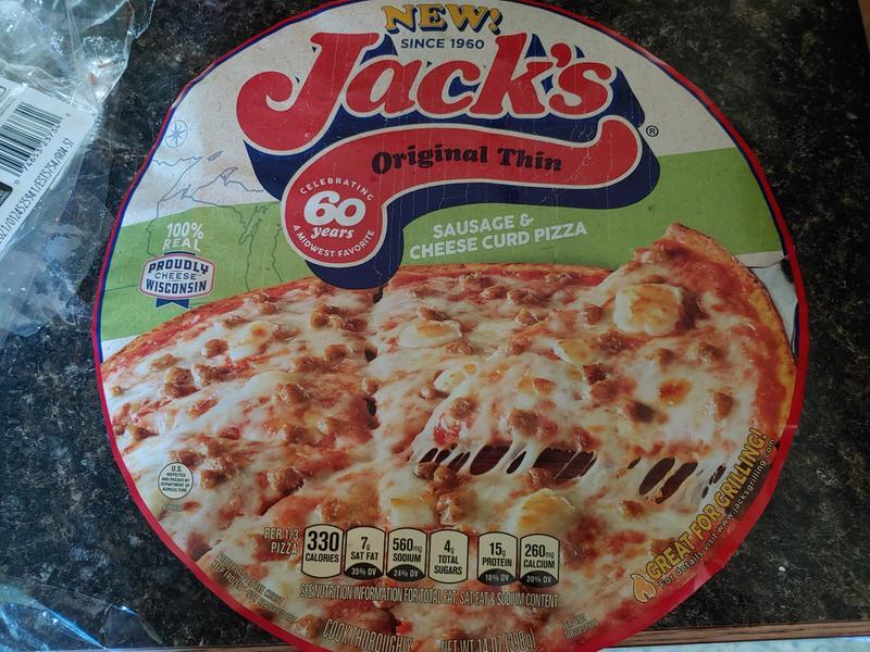 Calories in Jack's Pizza - Menu With Nutrition 1 slice, 1/3 pizza (5.5 oz) 390 Cal. Original Pepperoni & Sausage Frozen Pizza. 1 serving, 1/4 pizza (2.6 oz) 185 Cal. Super Cheese Cheese Frozen Pizza. 1 serving, 1/4 pizza (4.9 oz) 320 Cal. Original Bacon Cheeseburger Frozen Pizza. Original Thin Crust Cheese Frozen Pizza | Official JACK'S® PIZZA Calories: 310 % Daily Value* Total Fat 12g: 15%: Saturated Fat 6g: 30%: Trans Fat 0g: Cholesterol ...