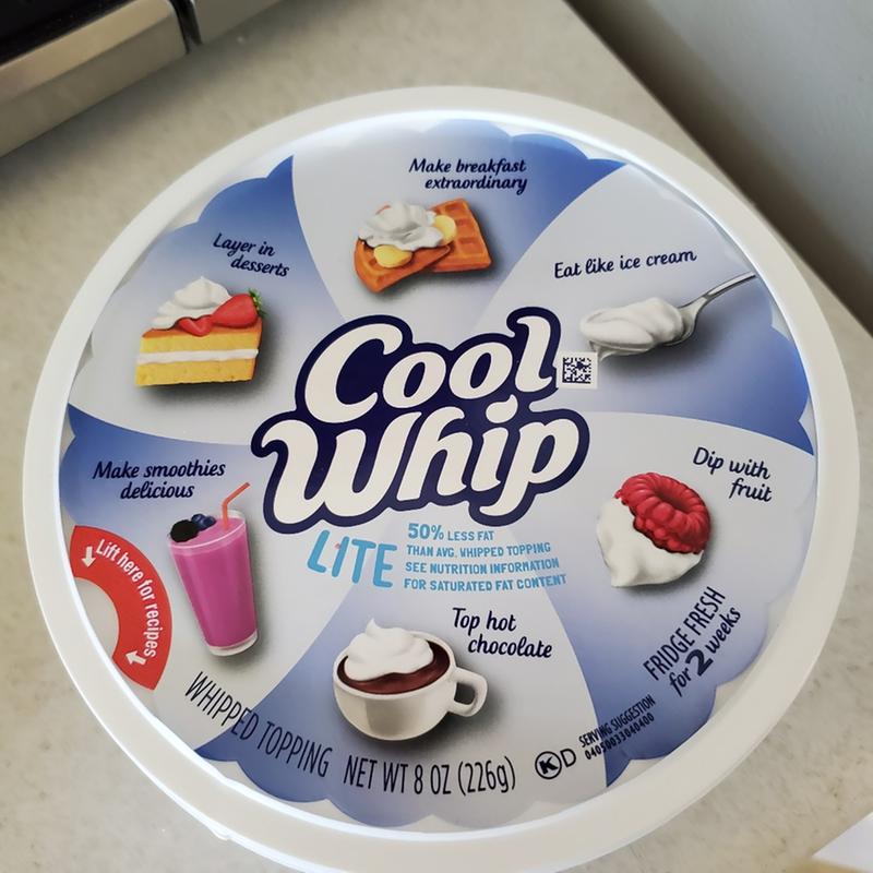 Cool Whip, Whipped Topping, Lite (8 oz) - Smart and Final Contains 0 g lactose per serving. Comparison Per Serving: Cool whip lite whipped topping: calories:20; Fat: 0.5 g; Average whipped topping: Calories: 20; ... Cool Whip, Whipped Topping, Lite (8 oz) - Kowalski's On The Go Comparison Per Serving: Cool whip lite whipped topping: calories:20; Fat: 0.5 g; Average whipped topping: Calories: 20; Fat: 1.5 g. Per 2 Tbsp: 20 calories; 0.5 ... Calories in Kraft Cool Whip Lite and Nutrition Facts 1 Apr 2021 — There are 20 calories in 2 tbsp (9 g) of Kraft Cool Whip Lite. Get full nutrition facts for other Kraft products and all your other favorite ...