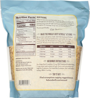 › i › quaker-oatsCalories in Old Fashioned Oats from Quaker Oats Sep 14, 2021 · Old Fashioned Oats Quaker Oats Nutrition Facts Serving Size: cup dry (40 g ) Amount Per Serving Calories 150 % Daily Value* Total Fat 3g 5% Saturated Fat 0.5g 3% Trans Fat 0g Cholesterol 0mg 0% Sodium 0mg 0% Total Carbohydrates 27g 9% Dietary Fiber 4g 16% Sugars 1g Includes 0g Added Sugars 0% Protein 5g Vitamin D 0mcg 0% Calcium 1.5mg 0% › regular-rolled-oatsOld Fashioned Rolled Oats | Bob's Red Mill Natural Foods Old Fashioned Regular Rolled Oats make a deliciously wholesome, chewy, hot cereal that provides lasting energy all morning. This favorite breakfast cereal is a great way to start your day and add fiber to your diet. They're freshly milled from the highest quality oats available anywhere.