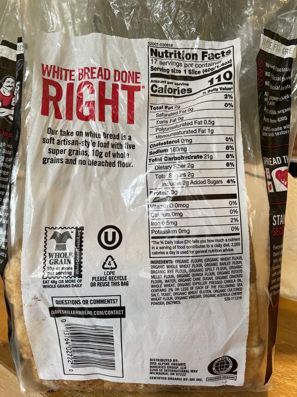 White Bread Done Right — Dave's Killer Bread It has the softness and flavor you'd expect from quality white bread, but with the healthy whole grains you'd expect from a premium packaged loaf of bread. Highly recommended if you can justify the $6 per loaf it can sometimes go for. Helpful? 10 Miami, FL Review 1 Votes 20 Gender Male Age 45 to 54 Children in Household: 2 ★★★★★ ★★★★★ Decoding Bread Labels - Consumer Reports 100% Whole Grains: This indicates that a bread's flour is made from the entire grain kernel—the bran, endosperm, and germ. Refined grains, such as white flour, contain only the endosperm. The ... White Made with Whole Grain Bread | Sara Lee® Bread Our White Made with Whole Grain Bread is made with 8 grams of whole grain per two slice serving. low fat food heart healthy: diets low in saturated fat and cholesterol and as low as possible in trans fat may help reduce the risk of heart disease. 8g or more of whole grain per serving 2 slices provide as much calcium as an 8 oz glass of milk Wonder Bread, Classic White: calories, nutrition analysis & more ... It makes bread look big and fluffy, icing look light and pillowy, and reduces the amount of fat and sugar needed in baked goods. Sodium Stearoyl Lactylate makes processed food cheaper, more beautiful and gives it a more appealing texture. We recommend avoiding it if because we like food to be processed as little as possible . . . More info