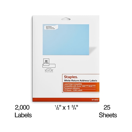 › Avery-5267-White-Laser-Return-AddressAvery Easy Peel Laser Return Address Labels, - Staples.com Avery Easy Peel Laser Return Address Labels, 1/2" x 1-3/4", White, 80 Labels/Sheet, 25 Sheets/Pack, 2000 Labels/Pack (5267) Item #: 466011 | Model #: 05267 | 4.6 372 Reviews | 2 Questions | Free Returns Highlights Ultrahold permanent adhesive is guaranteed to stick and stay on envelopes, cardboard, paper, glass or metal
