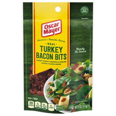 Oscar Mayer Turkey Bacon Bits Pouch, 4 oz Oscar Mayer Turkey Bacon Bits Pouch, 4 oz 4oz Made with real slices of Oscar Mayer Turkey Bacon, these Turkey Bacon Bits have endless possibilities! From salads to baked potatoes to nachos and more, you can add the smoky turkey bacon you love to any dish! NUTRITIONAL INFO YOU MAY ALSO LIKE... Bacon Bits Bacon Bits Bacon Bits SEE MORE