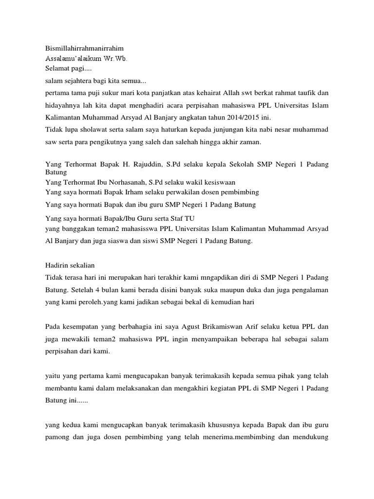 Kumpulan Contoh Kata Sambutan Acara Perpisahan Ppl Terimakasih khususnya kami ucapkan kepada guru pamong dan dosen pembimbing yang telah menerima, membimbing dan mendukung kami di SMK ini untuk belajar, untuk mengaplikasikan ilmu yang diperoleh di perkuliahan, untuk menjadi guru yang baik dan benar dan menjalankan program-program PPL yang mudah-mudahan akan bermanfaat bagi kami dan kita semua …