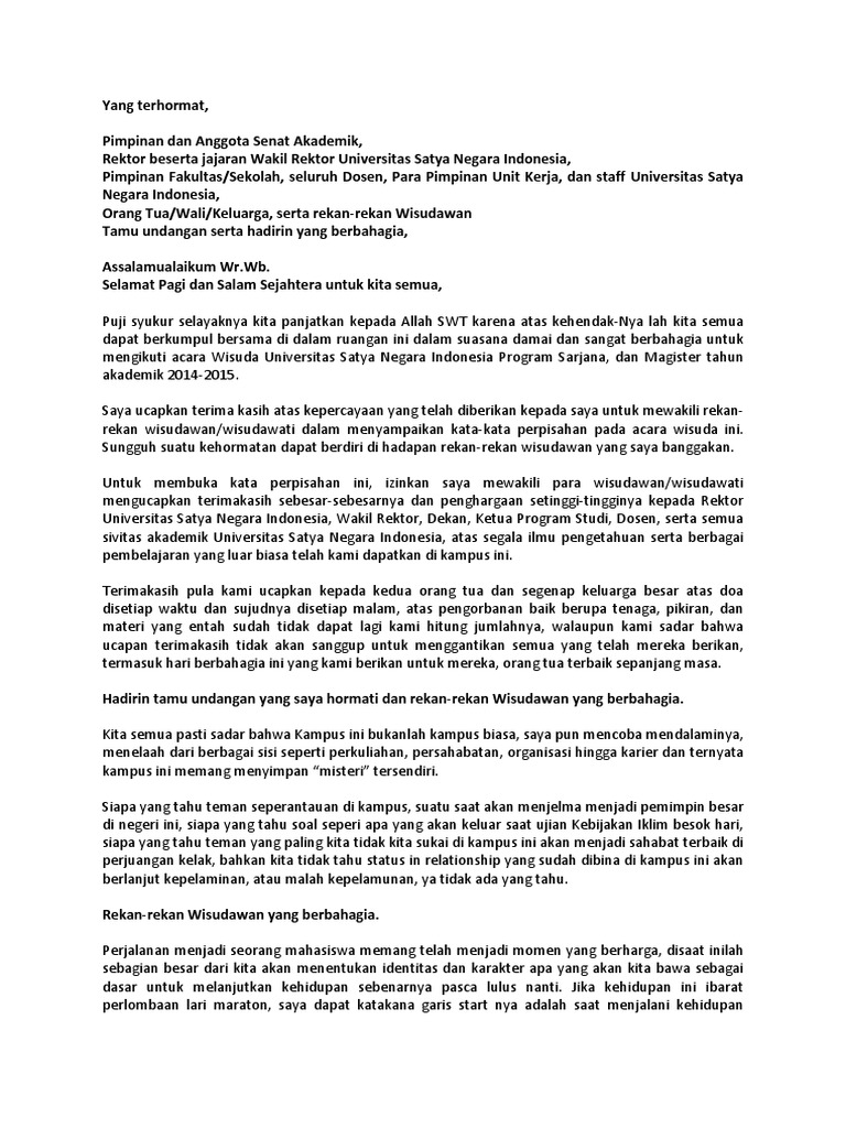 Contoh Ucapan Perpisahan (Farewell) dalam Bahasa Inggris Berikut beberapa contoh ucapan Farewell dalam Bahasa Inggris yang bisa Anda gunakan untuk beberapa situasi. 1. Perpisahan Pensiunan. It has been a great journey together in this company. Thank you for all the good memories. Farewell to you good friend and good luck on your own journey. (merupakan perjalanan menyenangkan bersama dalam Perusahaan. 5 Contoh Pidato Perpisahan Sekolah yang Singkat dan Bermakna Jika kamu menjadi perwakilan tersebut, maka kamu perlu menyiapkan kata-kata yang menyentuh dan bermakna untuk dibaca di hadapan para guru, siswa, dan orangtua. Berikut adalah 5 contoh pidato perpisahan yang bisa kamu jadikan referensi. 1. Pidato perpisahan SD. Pidato perpisahan yang pertama ini ditujukan untuk perpisahan Sekolah Dasar (SD). 20 Kata Perpisahan untuk Atasan yang Resign - Glints Blog Agar semakin berbekas di benak atasan, mungkin ucapan ini bisa kamu ucapkan saat mengadakan acara perpisahan untuknya. Dengan bimbingan Bapak/Ibu, saya belajar dan berkembang sangat banyak. Terima kasih telah menjadi sosok yang selalu suportif selama ini. Semoga sukses di perjalanan karier selanjutnya.